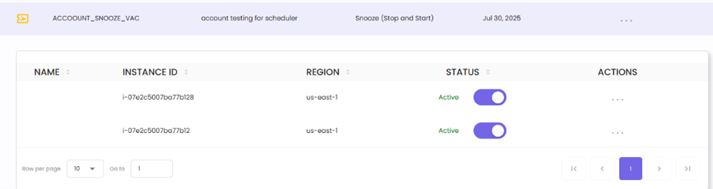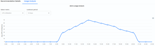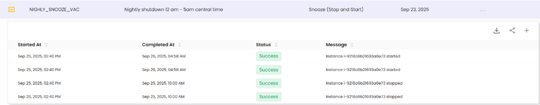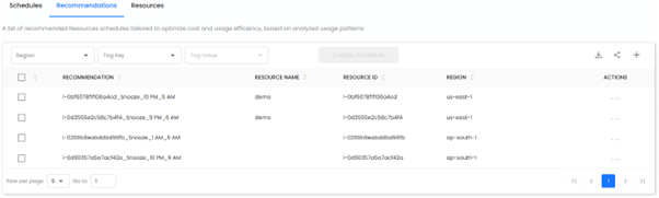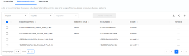 The Recommendations Screen displays a list of recommended snooze schedules tailored to optimize resource utilization and cost efficiency. These recommendations are generated based on usage analytics, helping users identify optimal start and stop times for cloud resources.
