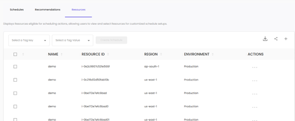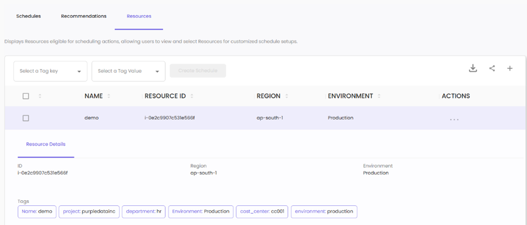 The Resources section allows you to view and manage resources eligible for scheduling actions.