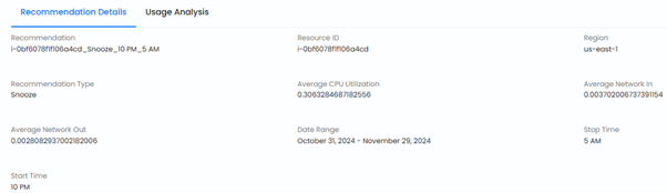 Displays key information about the recommendation: - Resource ID, Name, and Region - Recommendation Type (e.g., Snooze) - Date Range and Start/Stop Times - Average CPU Utilization and Network In/Out metrics