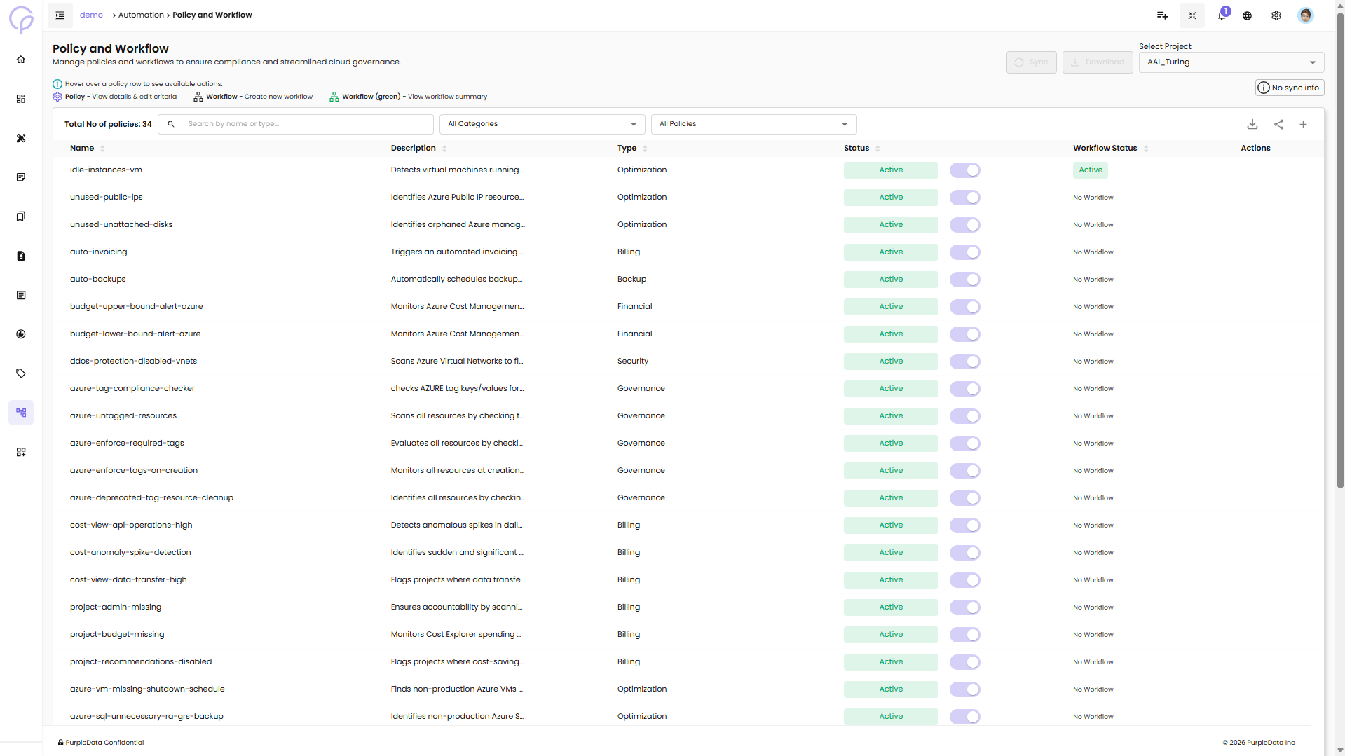 Manage policies and workflows to ensure compliance and streamlined cloud governance. The Policy and Workflow page provides a centralized location to monitor, configure, and automate responses to cloud events.