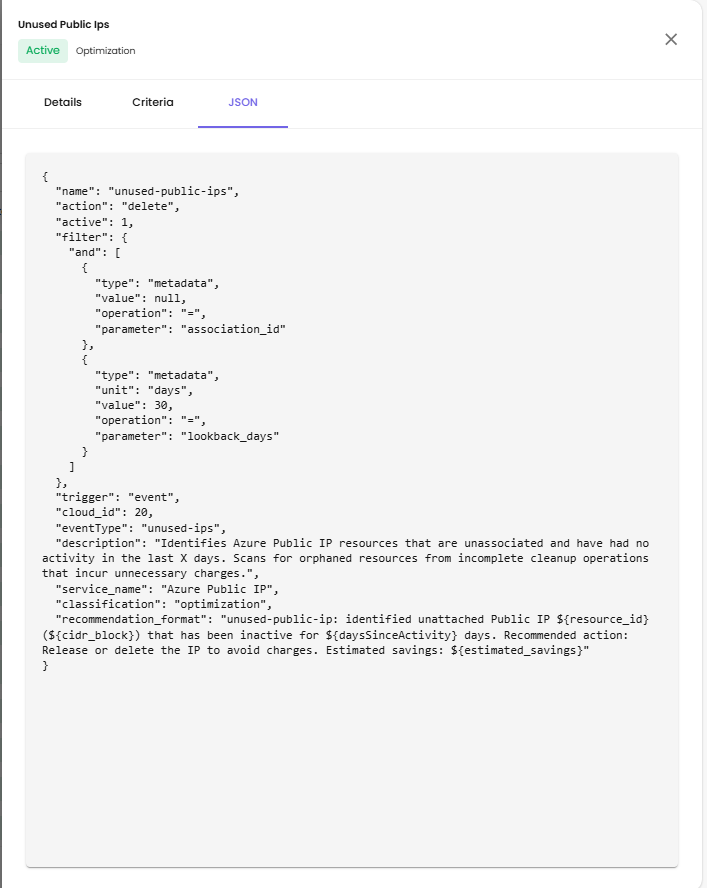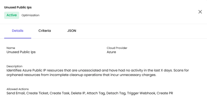 Description - Full description of the policy's purpose (e.g., "Identifies Azure Public IP resources that are unassociated and have had no activity in the last X days. Scans for orphaned resources from incomplete cleanup operations that incur unnecessary charges.")