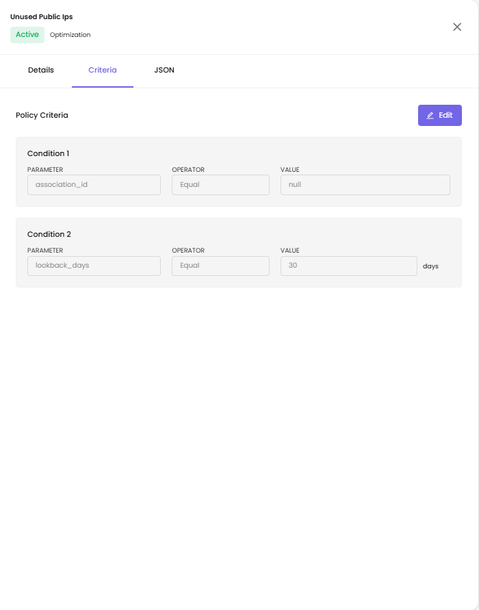 Shows the policy criteria with editable conditions. Click the Edit button to modify criteria.