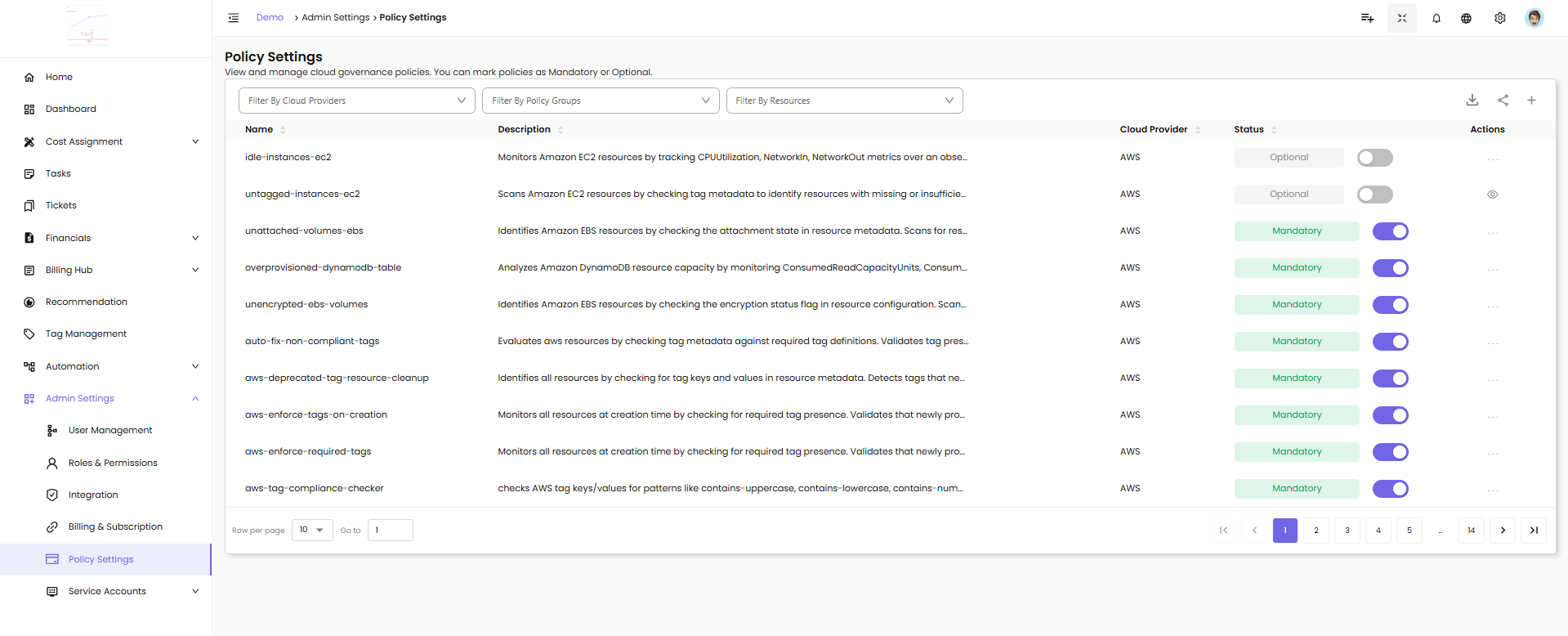 Policy Settings - View and manage cloud governance policies. You can mark policies as Mandatory or Optional.