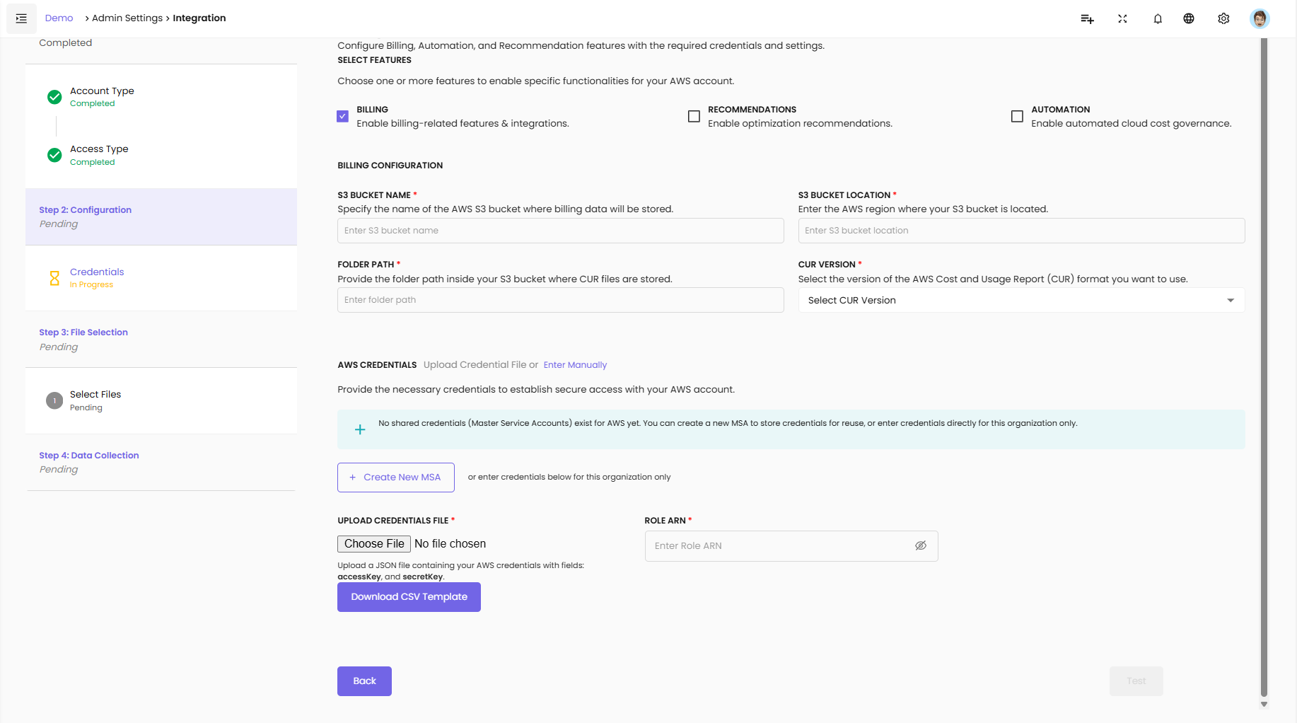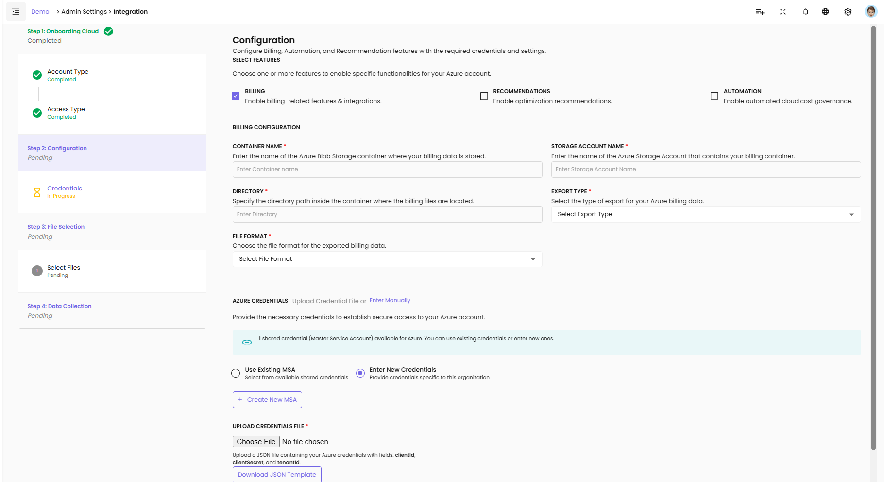 Configure Billing, Automation, and Recommendation features with the required credentials and settings.
