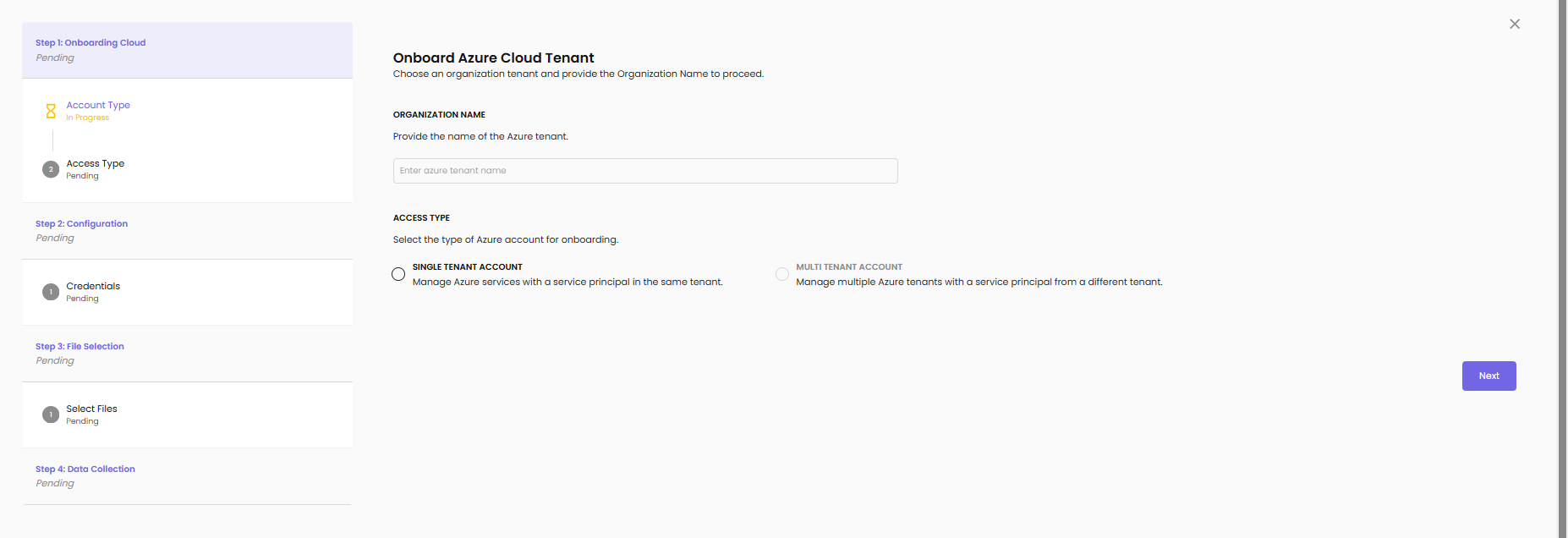 Access Type - Select the type of Azure account for onboarding: - Single Tenant Account - Manage Azure services with a service principal in the same tenant - Multi Tenant Account - Manage multiple Azure tenants with a service principal from a different tenant