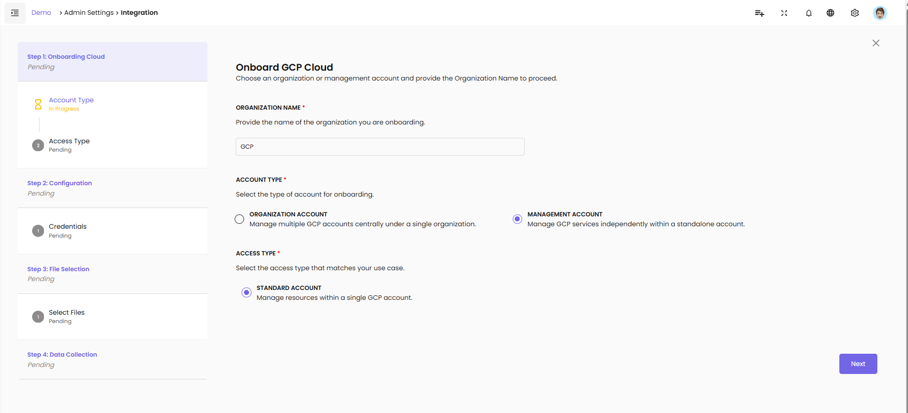 Get started by selecting your GCP account and access configuration. Provide your organization name to proceed.