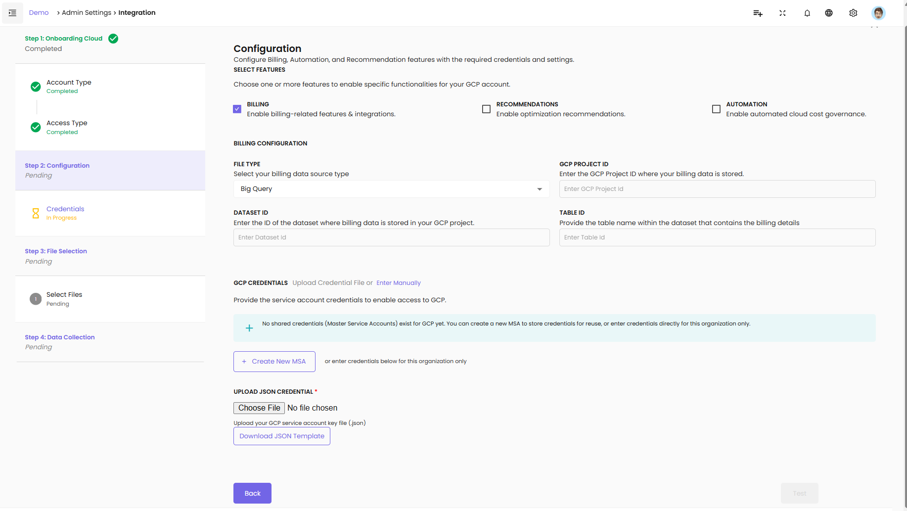 - No shared credentials (Master Service Accounts) exist for GCP yet. You can create a new MSA to store credentials for reuse, or enter credentials directly for this organization only.