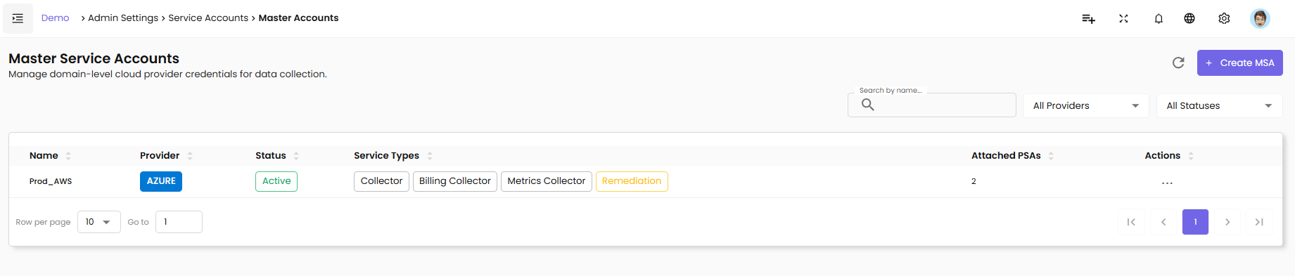 Master Service Accounts are domain-level cloud provider credentials used for data collection across the organization. MSAs provide centralized credential management and can be shared with multiple Project Service Accounts.