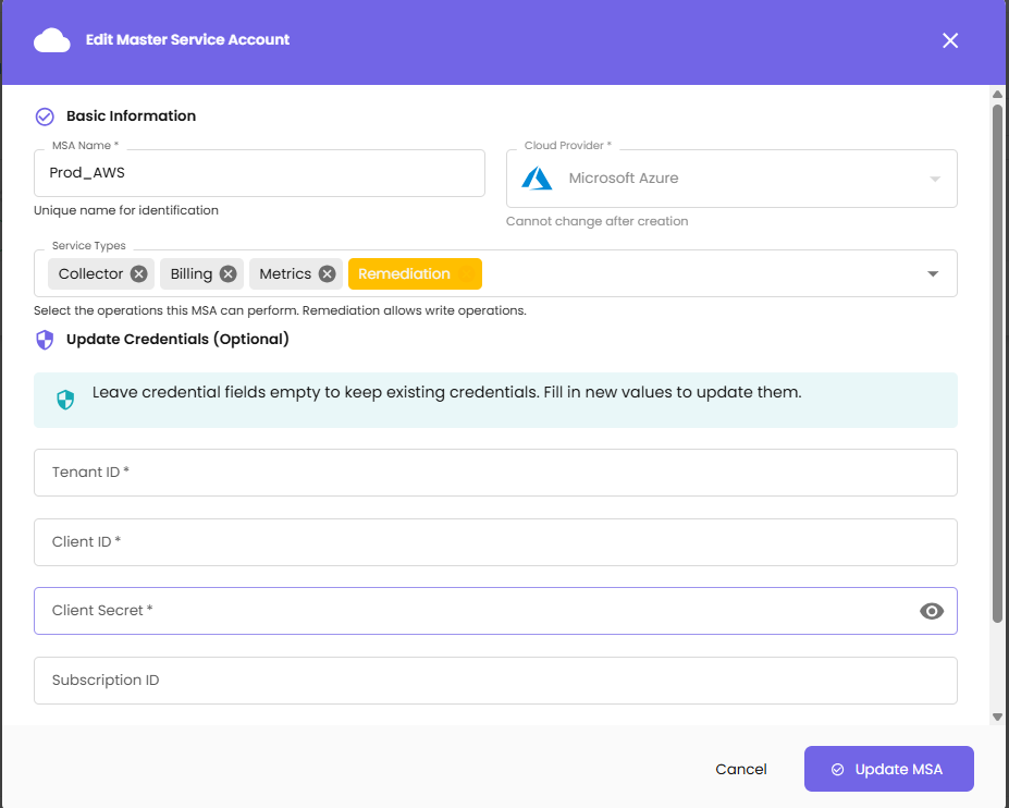 Basic Information: - MSA Name - Update the unique identifier - Cloud Provider - Displayed but cannot be changed after creation - Service Types - Add or remove service types (Collector, Billing, Remediation shown as tags)