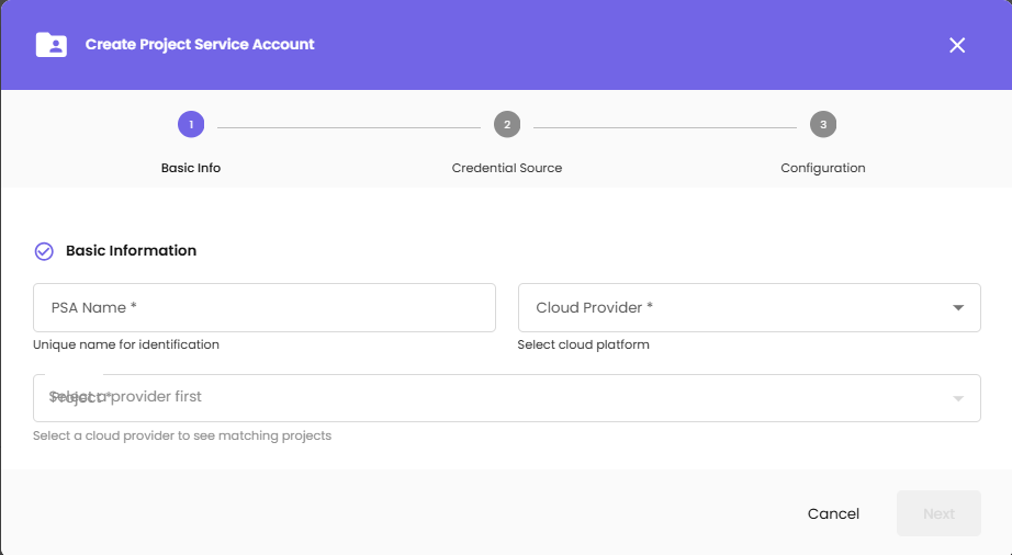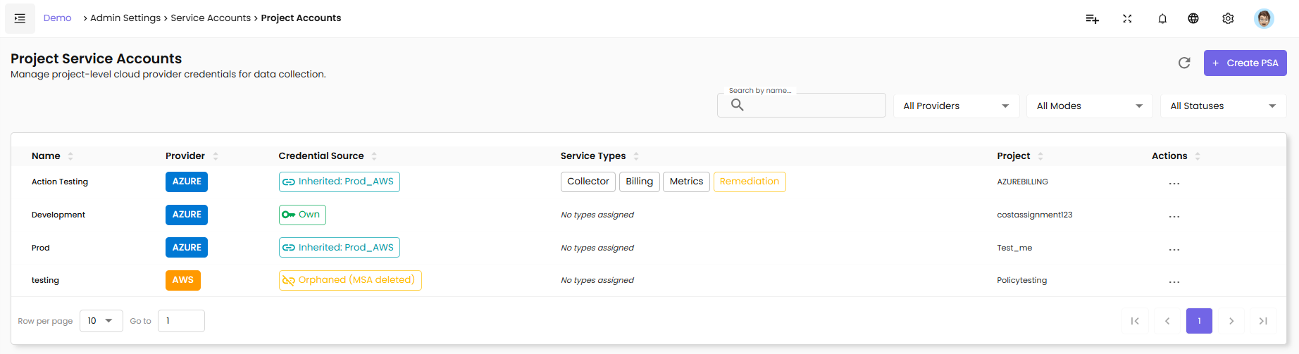 Project Service Accounts are project-level credentials that enable cloud connectivity for specific projects. PSAs can either maintain their own credentials or inherit them from a Master Service Account.