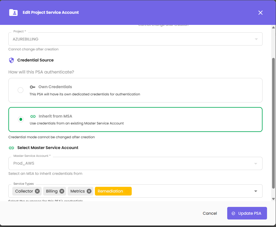 Inherit from MSA - Use credentials from an existing Master Service Account - Select an MSA from the dropdown to inherit credentials from - PSA uses the linked MSA's credentials - Credential mode cannot be changed after creation